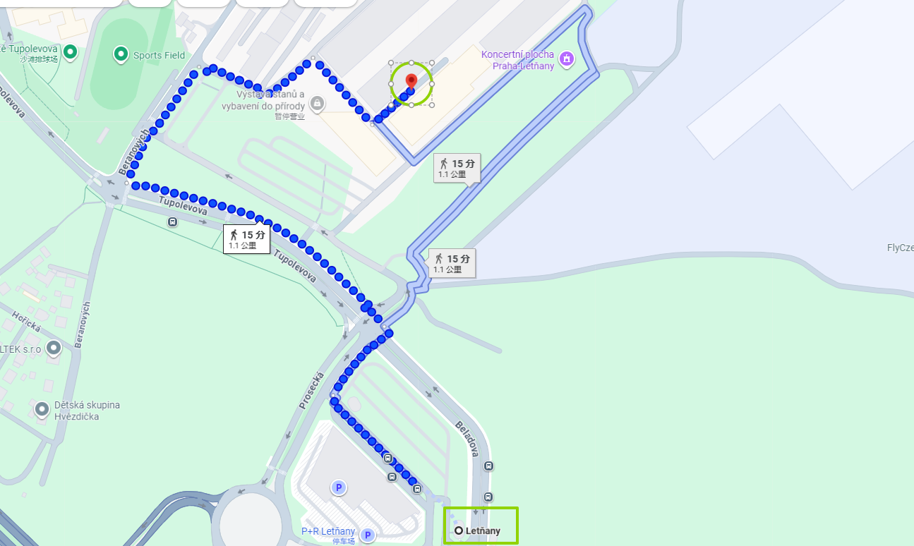 Letňany (metro C) + apytiksl. 15 min pėsčiomis